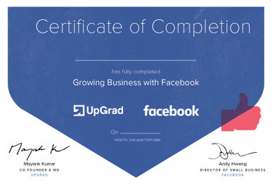 Upon running the FB campaigns and completion of the Facebook module, you will receive official certification from Facebook and UpGrad in business growth using FB.