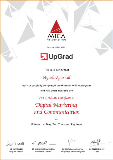 Complete the program successfully and recieve a Post Graduate Certification in Digital Marketing & Communication, along with individual PG Certifications in the specialisations you choose. You also receive official MICA Alumni Status and get to be a part of a community of Marketing Leaders